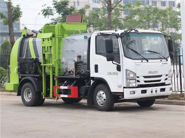 国六五十铃4.5方餐厨垃圾车上装配置:罐体容积4.5方,采用4mm优质碳钢制作,圆距形罐体,液压系统,配拉杆式提升机,可挂120/240升垃圾桶,推铲卸料,具有干湿分离,罐体尾门液压打开和锁紧+手动锁紧装置,罐尾设液体自流阀,液位窗,后门液压开启。用于运输液态垃圾,其特点操作简单,密封性好,无泄漏,无异味,常用于餐馆的垃圾转运处理。
