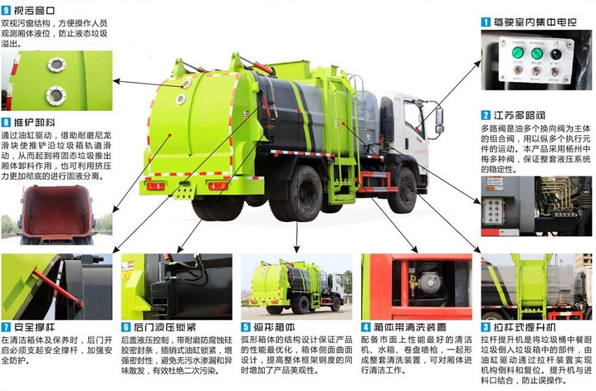 此款环卫垃圾车可加装配置:1、罐体内部固液分离功能(全推推板,不锈钢泔水分离网板);2、罐内加热功能(用于严寒地带防止罐内餐饮垃圾冻结凝固,采用柴油燃烧机加热,加热速度快效果好,可设置高低温实现自动温控);3、称重功能(垃圾桶提升架称重计量);4、罐体清洗装置(加装高压泵与高压水枪);5、吸污功能(利用真空吸污装置直接将餐饮垃圾吸入罐体)