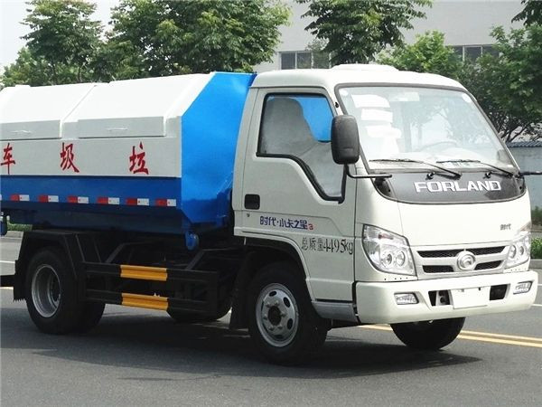 国六福田小卡之星4方勾臂式垃圾车上装配置:厢体材质为优质碳钢,一车可配多个垃圾箱,厢体厚度(单位):边2底3,厢体容积2-3立方,厢体两侧和后部为可开式垃圾口设计,方便垃圾的收集合倾倒。翻转架与活动拉臂垃圾车动作设计合理可靠,实现拉箱、锁紧、放箱和自卸操作简单方便。厢体放置在副车架时,通过锁紧架的锁紧,使整车在行驶过程中箱体牢固稳定,同时在自卸过程中使箱体与活动拉臂及翻转架连成—体,形成自卸角;当在放置或拉起拉臂垃圾车箱体时,锁紧架的收回动作使得翻转架与附车架连为一体,便于活动拉臂的放箱或拉箱;该机构的动作使得整车工作准确可靠操作系统,使用方便简单,通过液压缸完成上厢,下厢,锁紧,自卸等作业实现一车配多厢的循环运转。