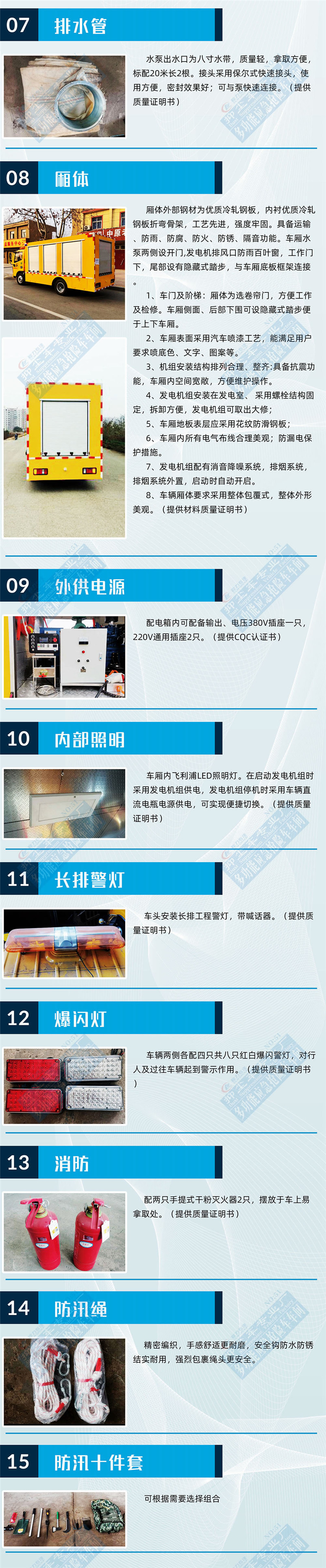 选装配置:选装行李架、爬梯、车顶工作台;选装不同形状、结构的**示灯;选装中隔断(可选择开门)、车身两侧可选开上掀门、盲窗、侧开门;花纹铝板;加装设备工具柜、配电箱、发电机组、水泵、电焊机、空压机等线路安装外接电源系统、(室内灯光照明、探照灯、高杆照明灯等);绕线盘,还可根据用户不同需求加装不同的维修抢险设备、车身制作专用图案或标识。
