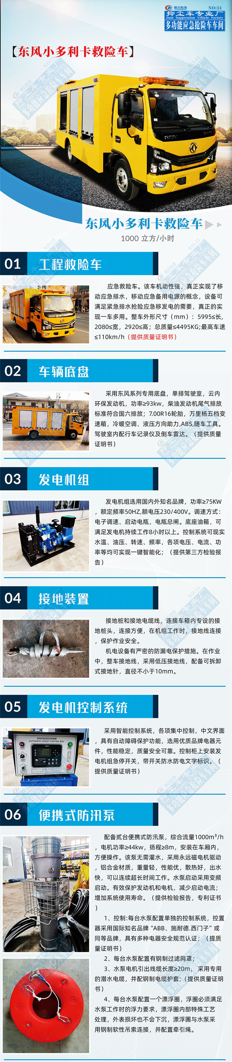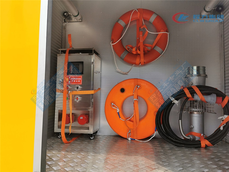 工程抢险车配备多台便携式潜水泵,泵体装有提手,方便搬运。水泵泵体采用高强度轻质铝合金材质制作,叶轮采用耐磨、耐腐蚀优质不锈钢制作,一体成型,潜水深度20米;水泵配有不锈钢丝滤网,有效阻止垃圾堵塞,损坏水泵;每台水泵上安装20米潜水电缆,电缆与**柜之间采用防护等级IP67的快速插头连接,操作简单,使用安全。单泵配置聚胺脂高强度浮圈,一体成型,满足水泵工作时的浮力要求,具卡口吊环连接软性吊索;水泵可以使用发电机组或市电正常工作。