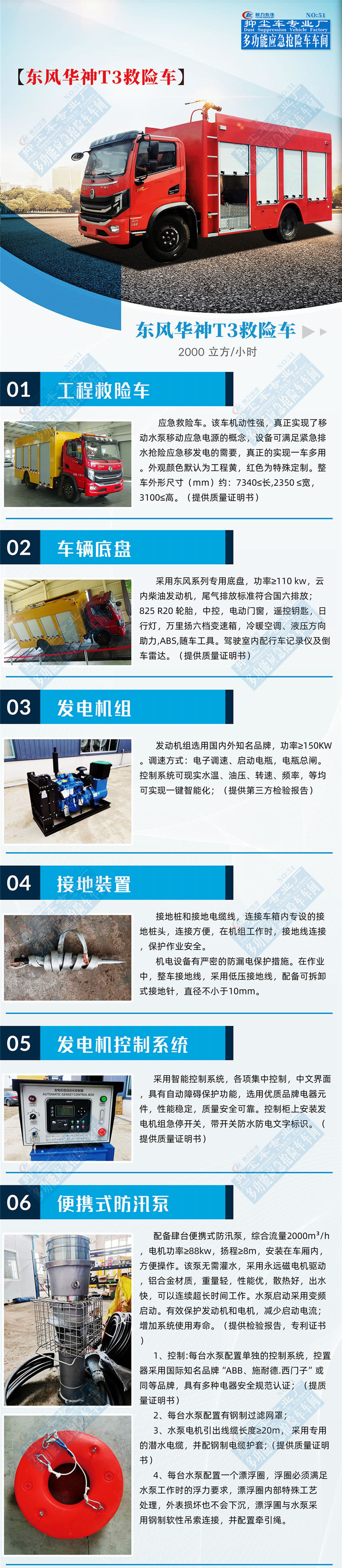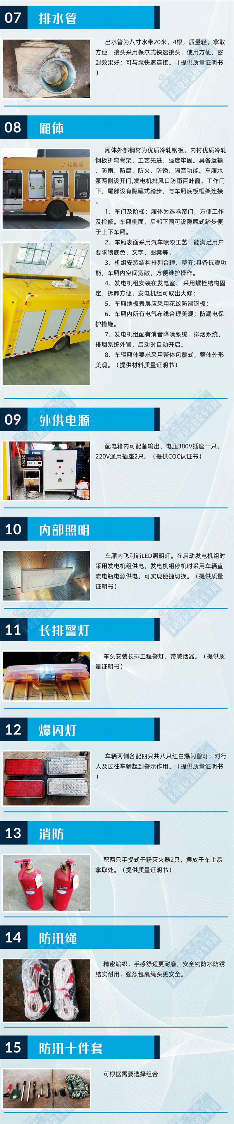工程抢险车配备多台便携式潜水泵,泵体装有提手,方便搬运。水泵泵体采用高强度轻质铝合金材质制作,叶轮采用耐磨、耐腐蚀优质不锈钢制作,一体成型,潜水深度20米;水泵配有不锈钢丝滤网,有效阻止垃圾堵塞,损坏水泵;每台水泵上安装20米潜水电缆,电缆与**柜之间采用防护等级IP67的快速插头连接,操作简单,使用安全。单泵配置聚胺脂高强度浮圈,一体成型,满足水泵工作时的浮力要求,具卡口吊环连接软性吊索;水泵可以使用发电机组或市电正常工作。