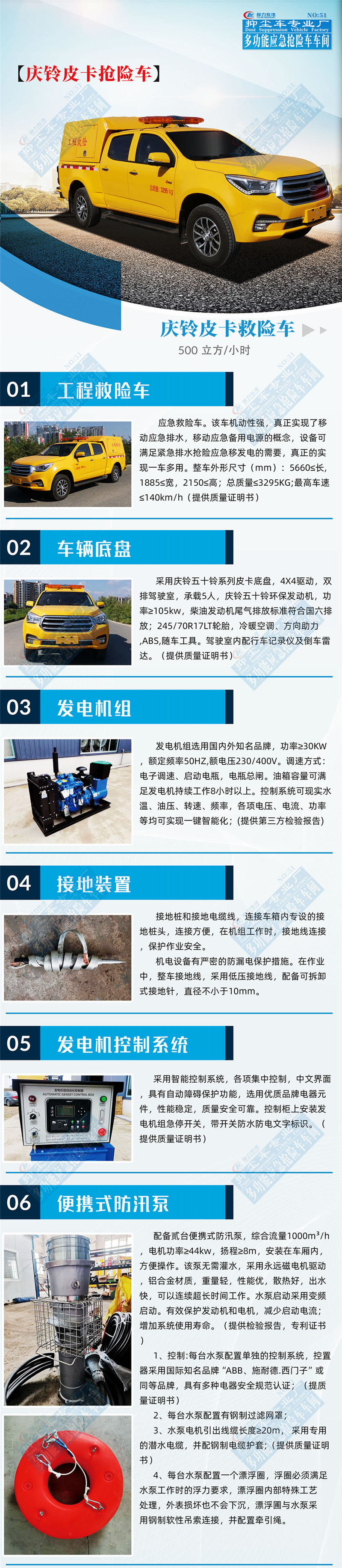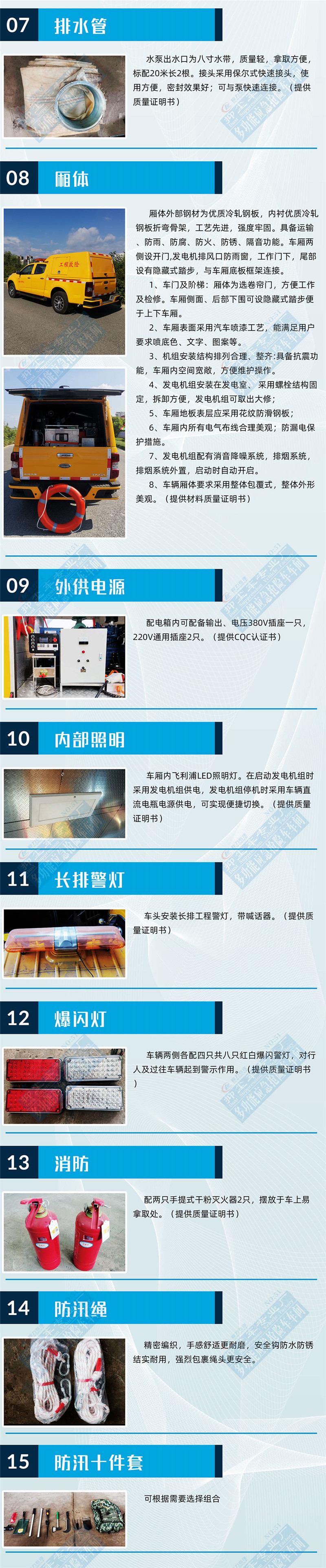 工程抢险车配备多台便携式潜水泵,泵体装有提手,方便搬运。水泵泵体采用高强度轻质铝合金材质制作,叶轮采用耐磨、耐腐蚀优质不锈钢制作,一体成型,潜水深度20米;水泵配有不锈钢丝滤网,有效阻止垃圾堵塞,损坏水泵;每台水泵上安装20米潜水电缆,电缆与**柜之间采用防护等级IP67的快速插头连接,操作简单,使用安全。单泵配置聚胺脂高强度浮圈,一体成型,满足水泵工作时的浮力要求,具卡口吊环连接软性吊索;水泵可以使用发电机组或市电正常工作。