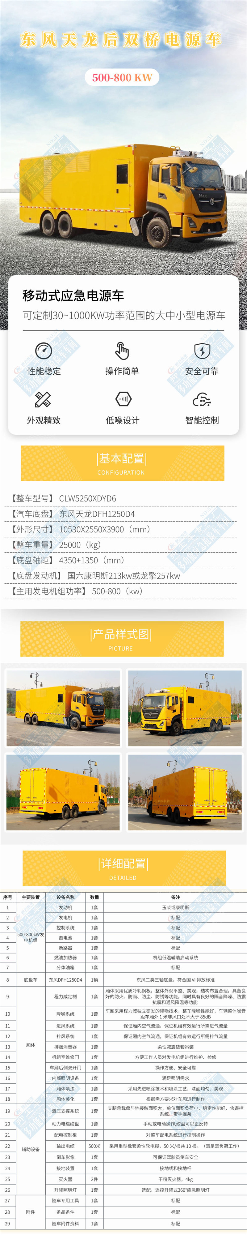 2、应急电源车按照功率划分可以分为10~50kw江铃底盘(小型)、50~100kw五十铃、东风(中型)、100~500kw五十铃、东风(中大型)、500~1000kw东风天龙(大型)、1000kw以上半挂(超大型);