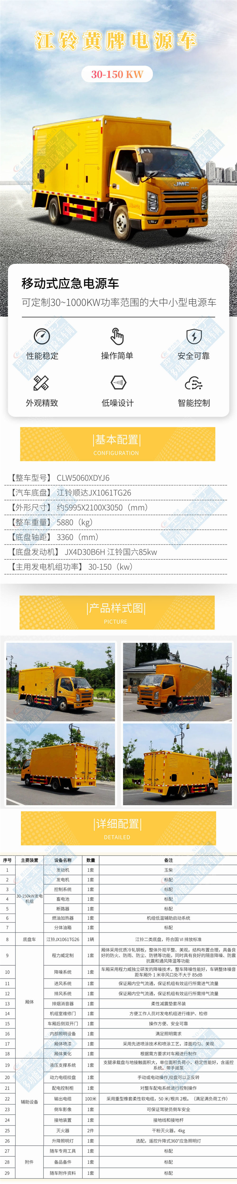 电源车可称为移动电源车、应急电源车、发电车。多功能应急电源车是在定型的二类汽车底盘上加装厢体及发电机组和电力管理系统的专用车辆,主要用于如果停电将会产生严重影响的电力、通信、会议、工程抢险和需要电力保障的等场所,作机动应急备用电源。电源车具有良好的越野性和对各种路面的适应性,适应于全天候的野外露天作业,而且能在高、低温和沙尘等恶劣的环境下工作。具有整体性能稳定可靠、操作简便、噪音低、排放性好、维护性好等特点,能很好的满足户外作业和应急供电需要。