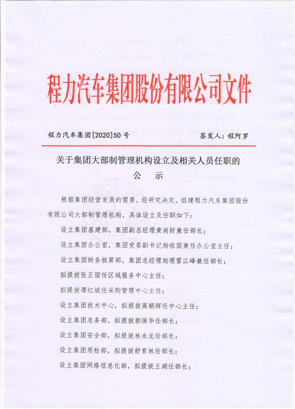 本报讯(通讯员徐春报道):近日,程力汽车集团股份有限公司企业管理大部制改革中高层负责人任命及集体谈话专题会议,在公司总部一号会议室隆重举行。