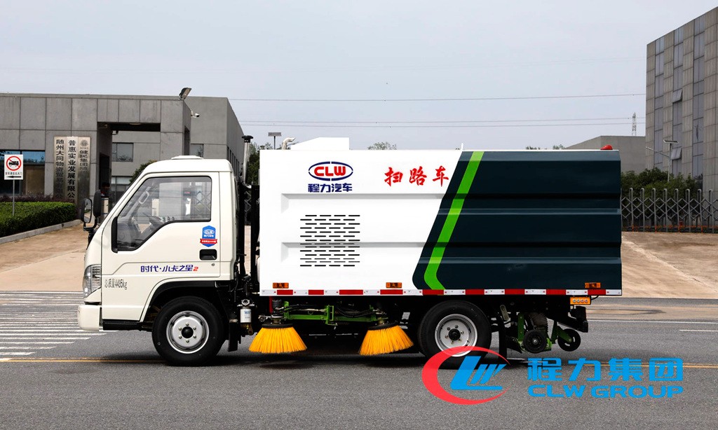 该福田扫路车国六二类底盘改装,加装副发动机、风机、清水箱、垃圾箱、左右立扫、后置吸盘,扫盘降尘系统,液压系统、专用装置电控系统和副车架等改装而成。