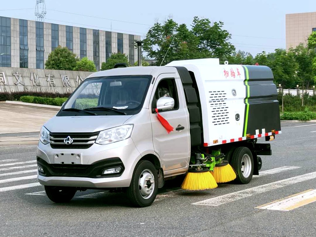 该扫路车长安国六二类底盘改装,加装副发动机、风机、清水箱、垃圾箱、左右立扫、后置吸盘,扫盘降尘系统,液压系统、专用装置电控系统和副车架等改装而成。